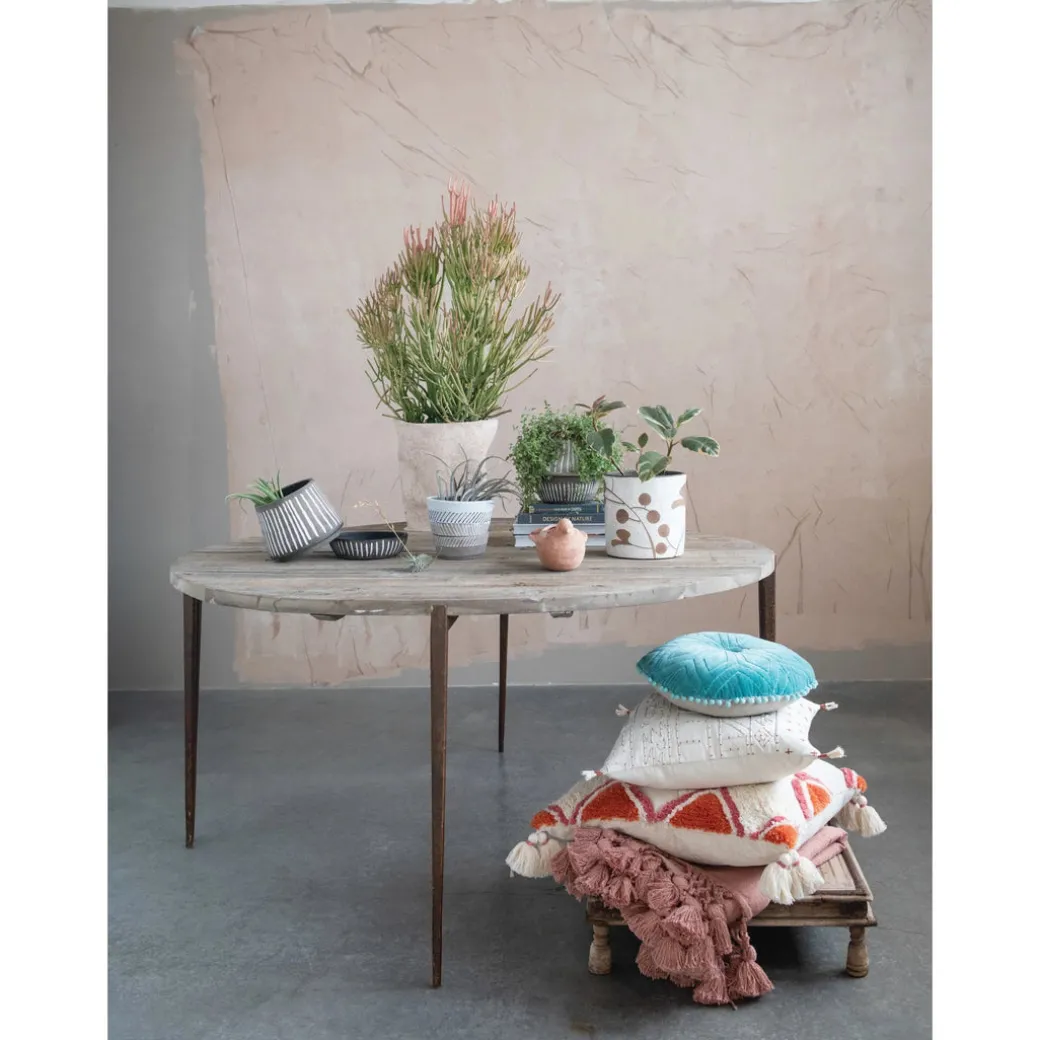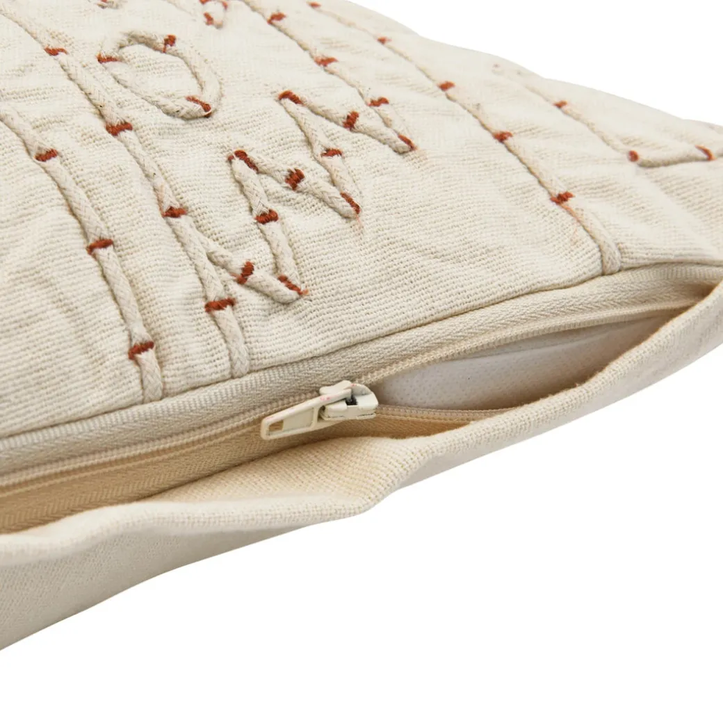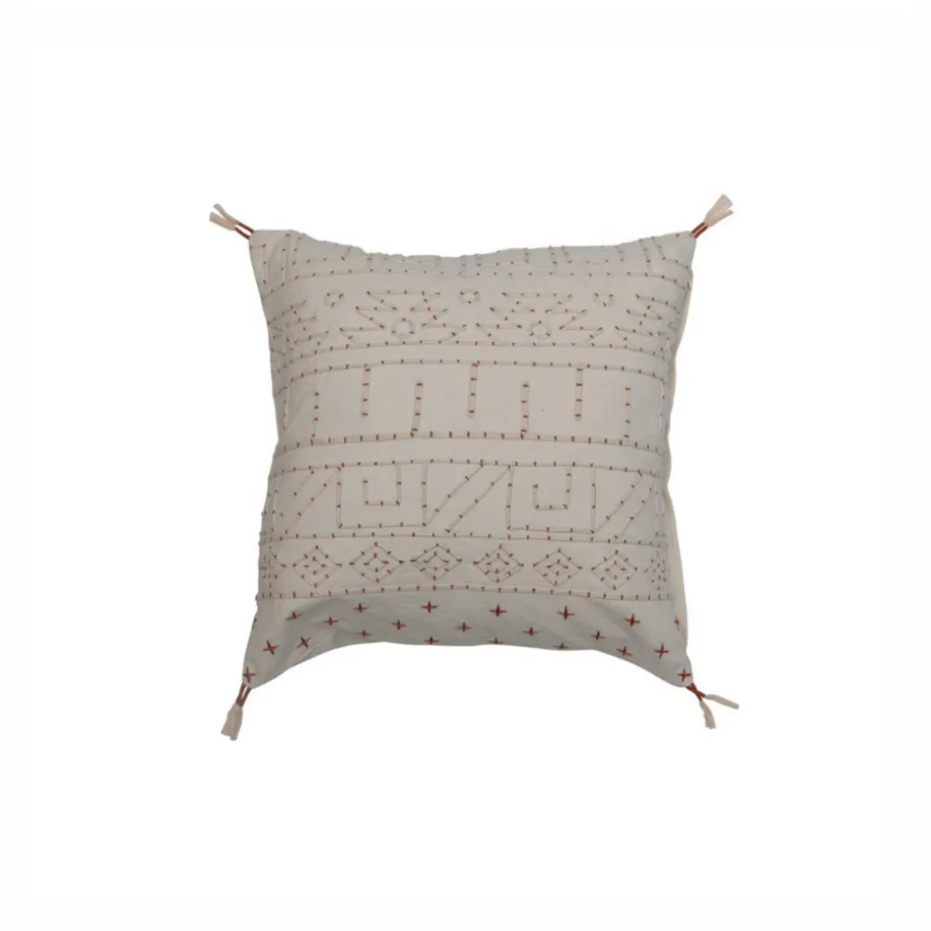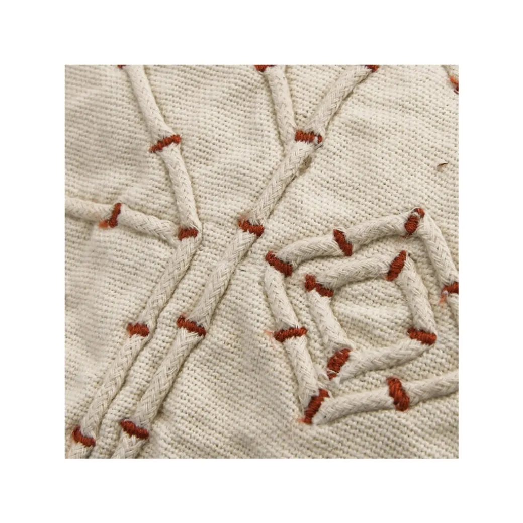 Coussin carré brodé en coton avec passepoil et pompons, couleur naturelle et rouille.