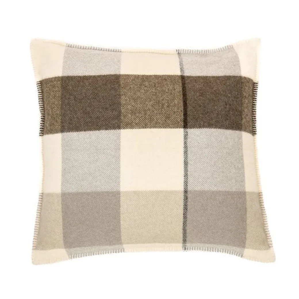 Oreiller en laine à carreaux dans les teintes de brun, de gris pâle et de crème. – Arrivage prévu pour avril