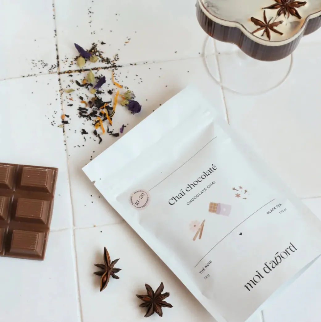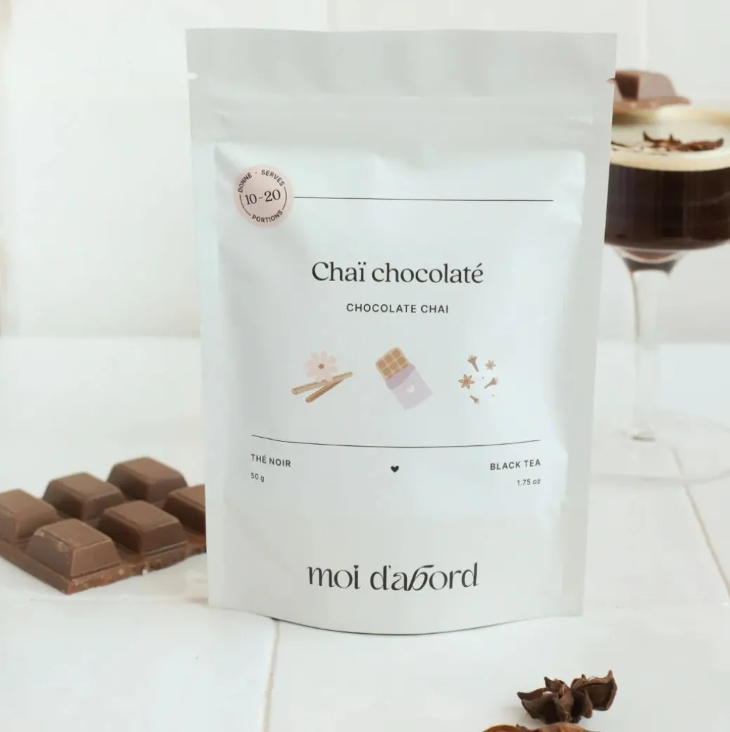 Ingrédients : Thé noir, Gingembre, Grains de cacao, Cannelle, Cardamome, Poivre noir et blanc, Clous de girofle, Noix de muscade, Bleuets des champs, Arômes naturels.