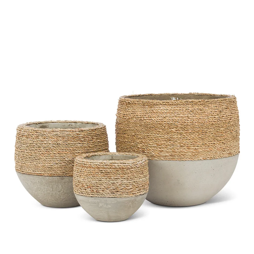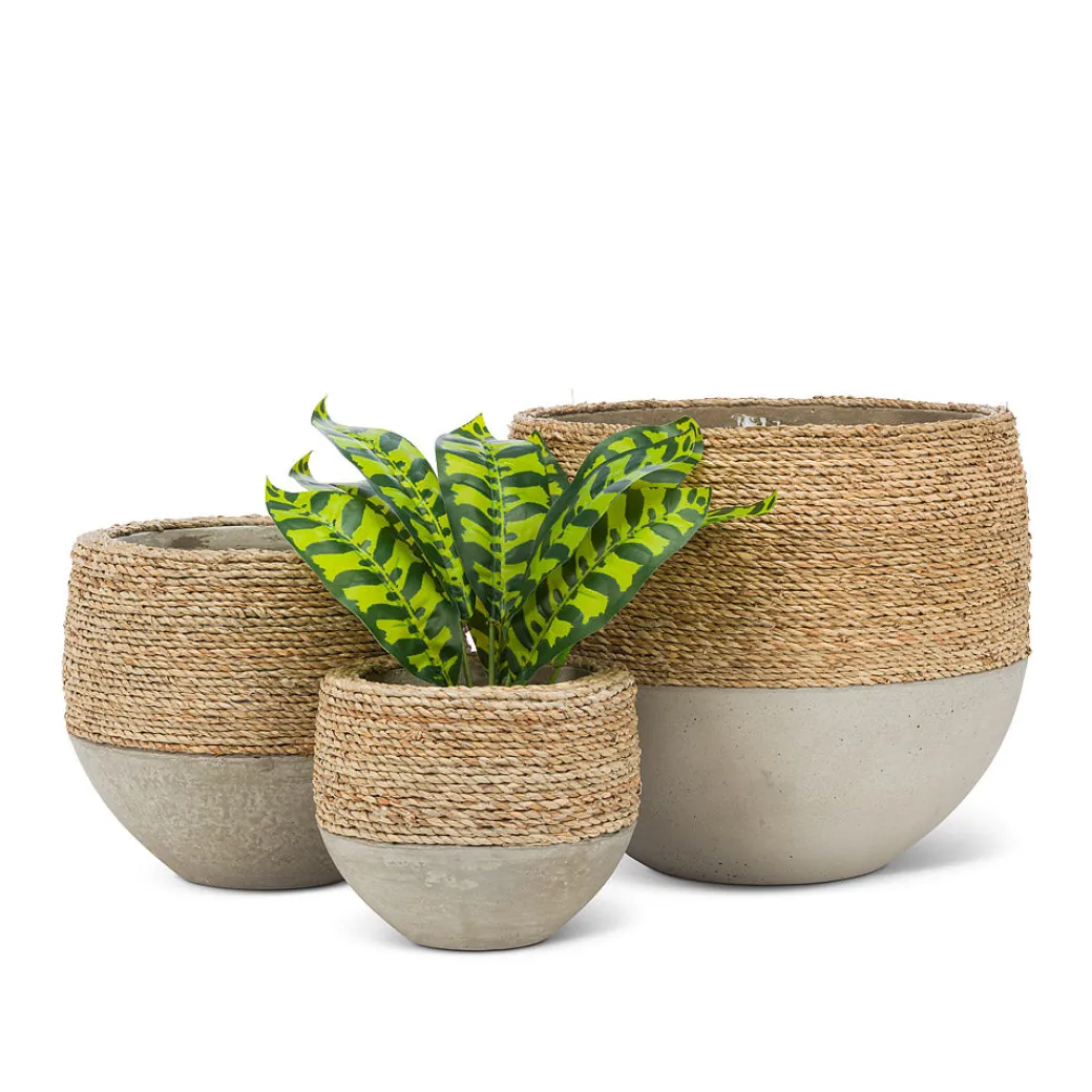 Offrez à vos plantes préférées une maison tropicale fabriquée à la main avec cette jardinière couverte de demi-jonc de mer rustique. Fabriquée en ciment et rehaussée d’herbes marines tissées naturelles, cette petite jardinière est un complément pittoresque à tout type de verdure décorative.