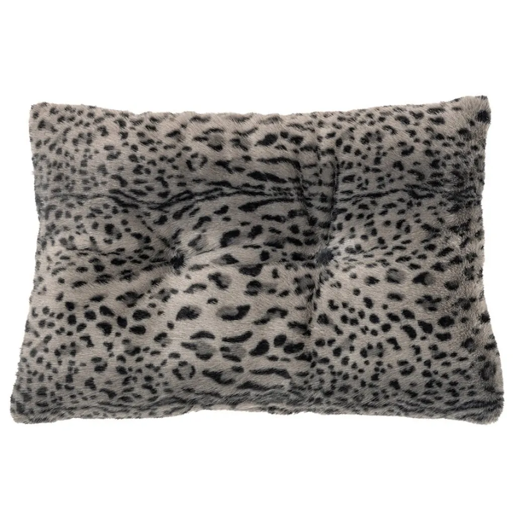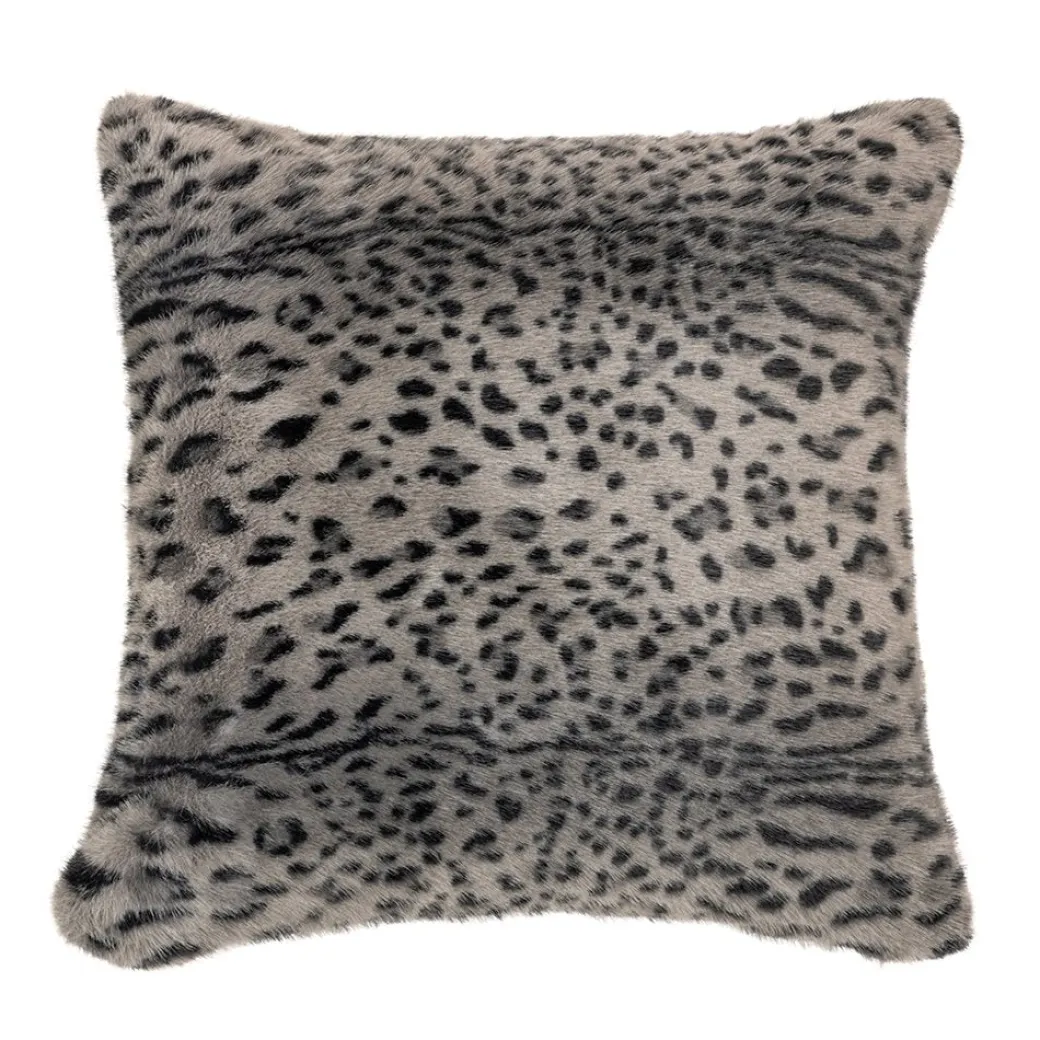 Coussin décoratif en fausse fourrure avec un imprimé de guépard dans les teintes de gris et de noir.