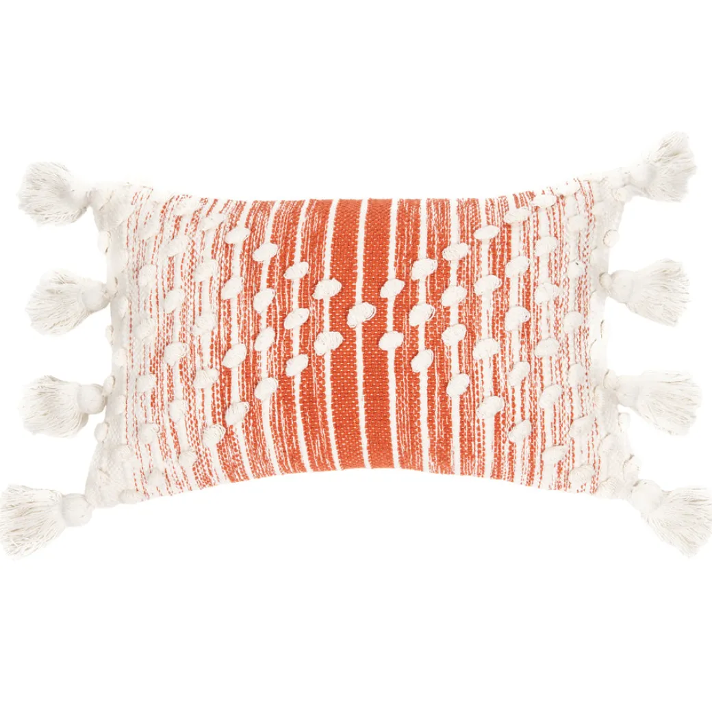 Coussin rectangulaire en tricot crème et corail avec pompons.