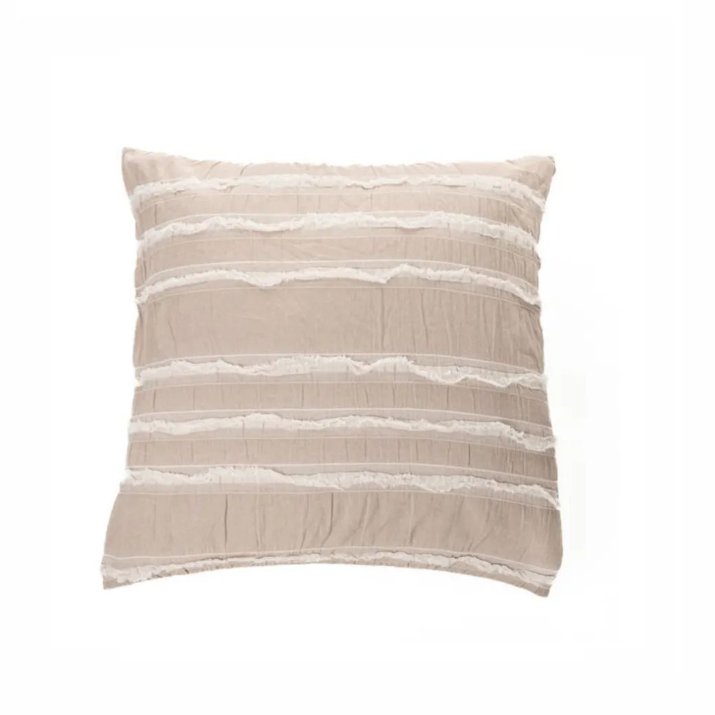 Ensemble de housse de couette taupe avec un motif de bandes effilochées. Munie d’une fermeture éclair et s’attache à l’intérieur pour aider au maintien de la couette.