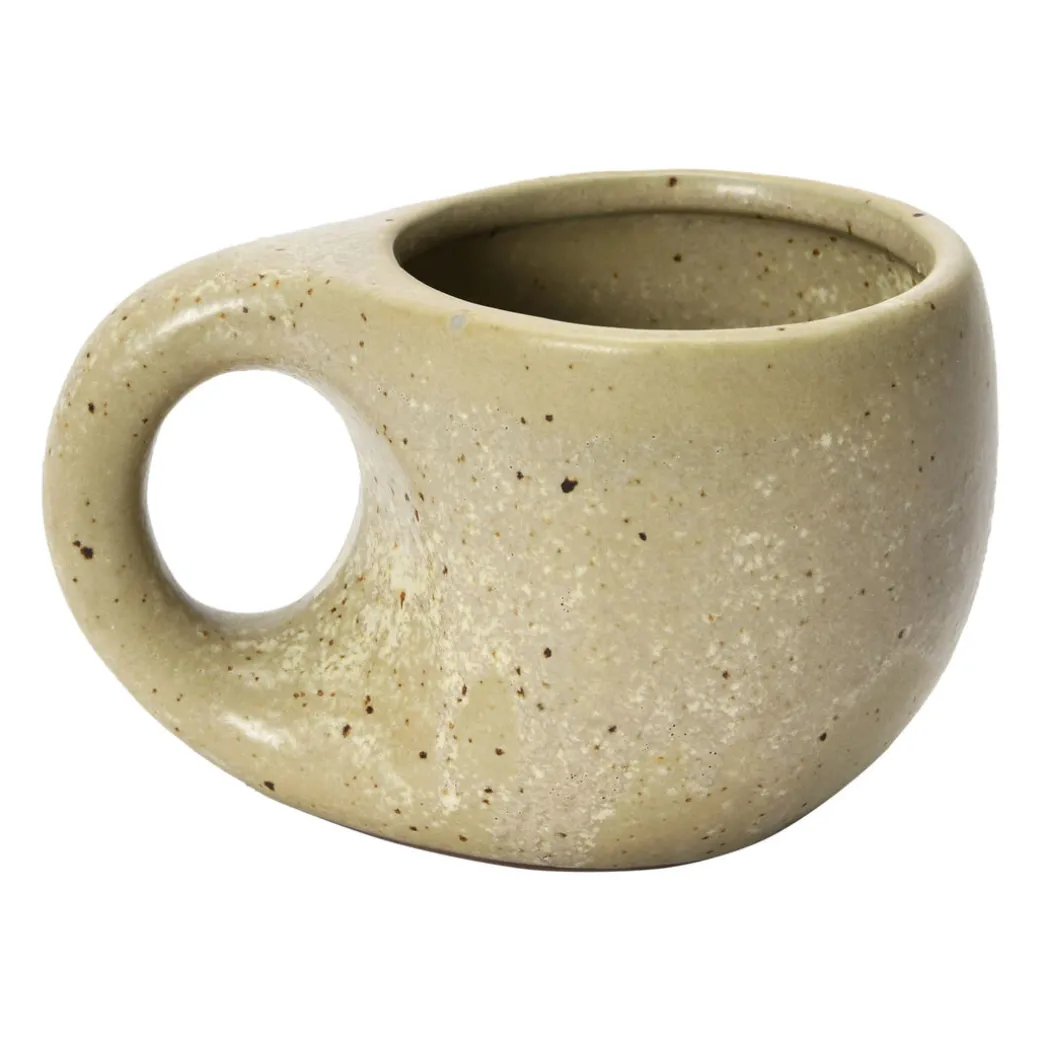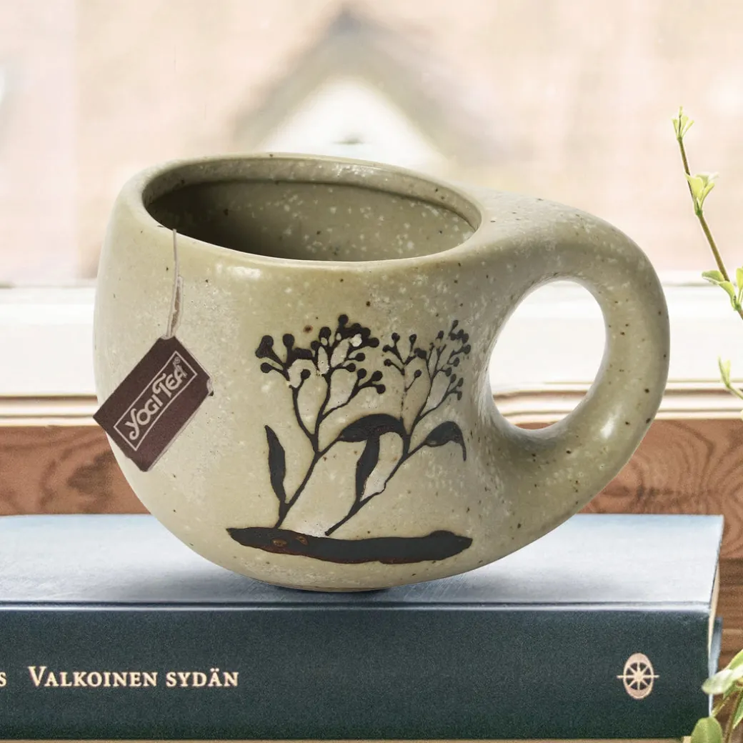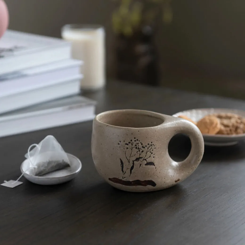 Tasse en grès avec image florale en relief de cire, glaçure réactive, couleur beige mouchetée et marron (chacune varie)